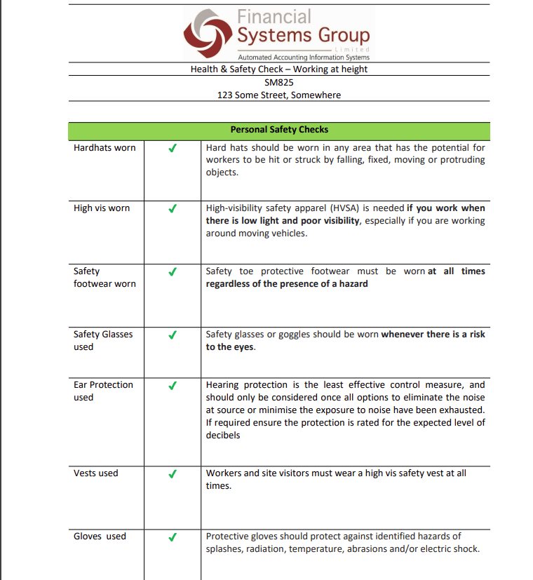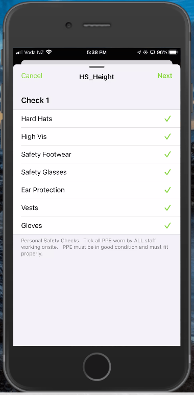 On opening the form the initial list of personal safety items will be displayed. To enable rapid data entry, the list uses a word or phrase. Simply tap the line if the item is OK. A green tick will be displayed on the mobile and the generated form. The generated PDF will include more information – for example, the line for Hard Hats automatically includes “Hard hats should be worn in any area that has the potential for workers to be hit or struck by falling, fixed, moving or protruding objects.”