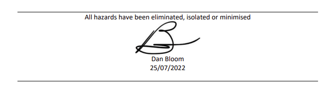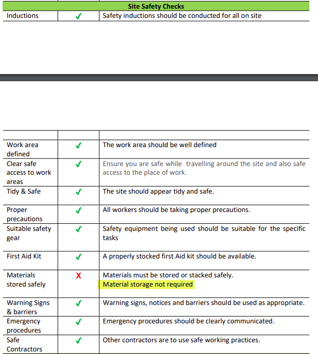 The site safety checks section uses the same display techniques as used by the PPE section. Items not ticked will display a red X as illustrated. “Material Storage not required” (Highlighted in the illustration – Highlight is not in the PDF) was loaded via a single tick within the mobile dialogue – alternatively, the user could have entered text.