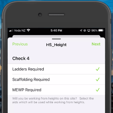 Working from heights is evaluated for 3 different access methods. Each access method will include best practice guidelines to ensure the safety of all. Each access method which will be used on the site is ticked from the 3 listed items. If an access method is ticked here, additional data entry screens will be displayed. If an access method is not ticked here, you will not see any additional questions for that method.