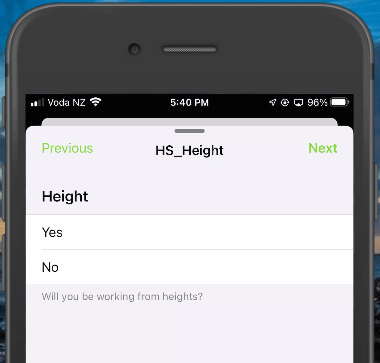The user is asked if working from heights should be addressed. If “No” – that’s the end of the questions. If however “Yes” is selected, the form will navigate thru the height options.