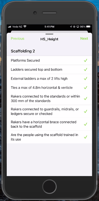 Each selected access method will display a list of recommended safety procedures. Scaffolding has 2 pages of items whereas ladders and MEWP have a single page of options. The user is to tick all of the safety options which will be used on the site. If the option is not applicable or will not be used on the site, don’t tick the line.
