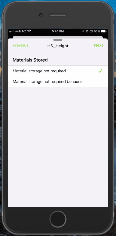 Failure to tick an item will display an option to very quickly tick “Not Required”. If user comments are appropriate select “Material storage not required because” – the user will then be able to enter text after “because”. The full comment will be included on the generated PDF.