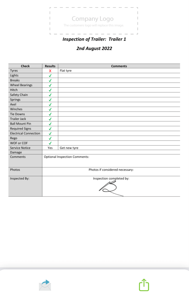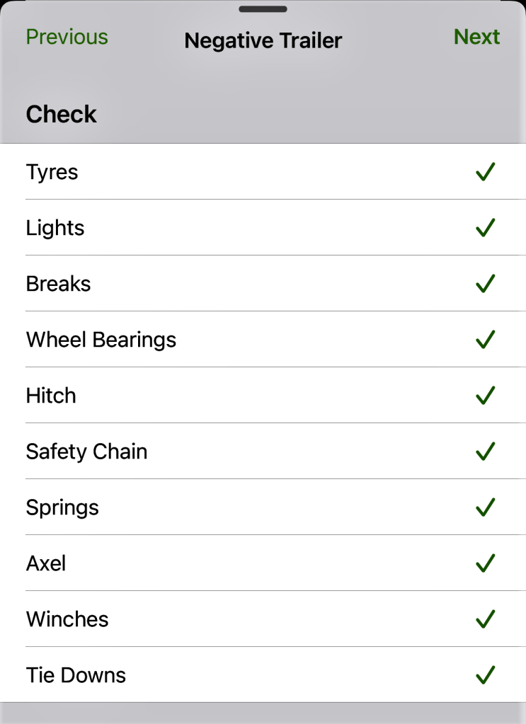 The trailer safety checklist forms are offered in alternative formats. Both forms use the tick box style selection wherein the user simply ticks a selected item. One alternative has the user select each item inspected and found to be good (Positive Trailer Check) whereas the alternative has the user select only those items which are of concern (Negative Trailer Check). The Positive form will require lots of ticks (slightly more time) vs the Negative form which only ticks items of concern (very rapid completion).